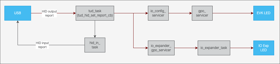 The tud_hid_set_report_cb sends GPO control commands to io_config_servicer and io_expander_gpo_servicer depending on where the LED that needs to be configured resides.