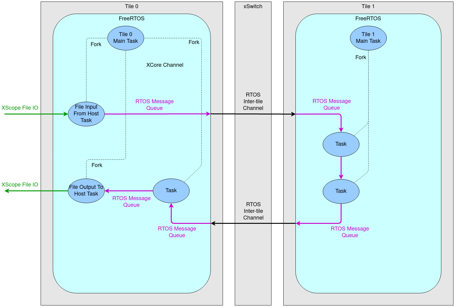 This FreeRTOS example application reads a WAV file from the host over an XSCOPE server, propagates the data through multiple threads across both tiles, and then writes the output to a WAV file on the host PC, also over an XSCOPE server.